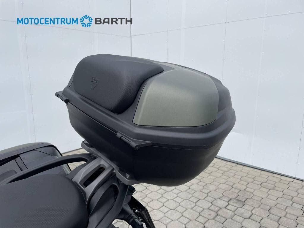 Součástí ceny motocyklu je: sada podpěr pro boční kufry, plastové boční kufry, sada krytů na kufry, sada podpěr na topcase, TOPCASE Ducati.