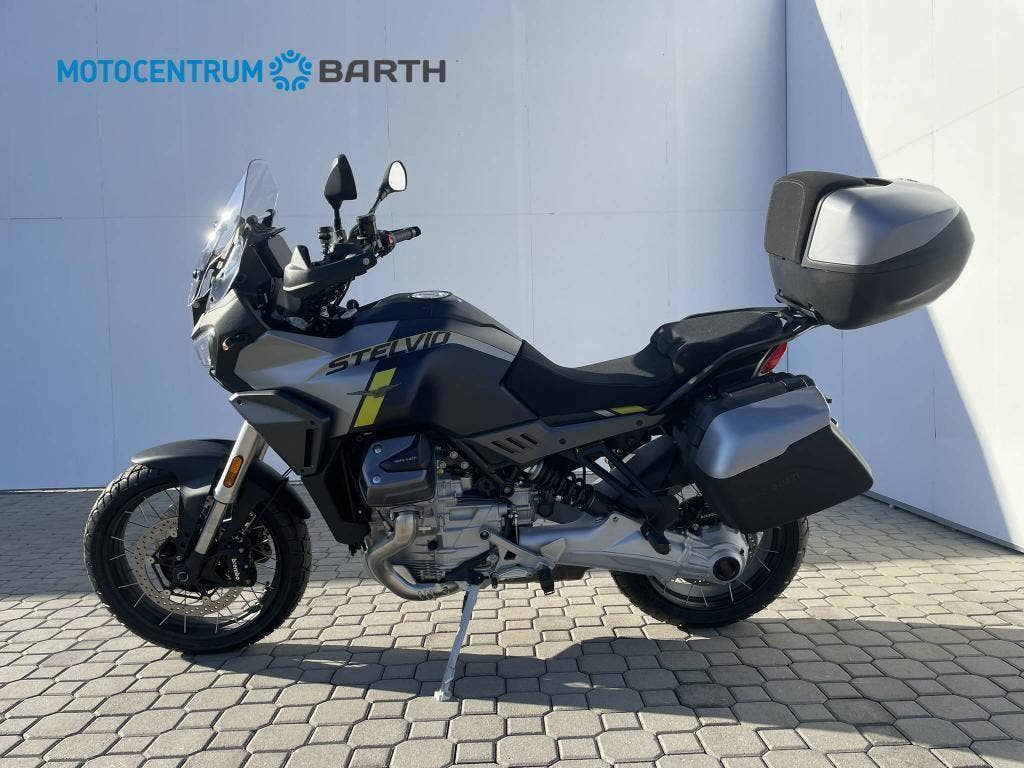 Součástí ceny jsou boční kufry a TOPCASE., Stelvio s temperamentem rozeného průzkumníka a neohroženým duchem je moderní adventure tourer, který v každém detailu odráží dědictví značky Moto Guzzi a kombinuje moderní, minimalistické linie s nejmodernějšími dostupnými technologickými řešeními, jako je PFF Rider Assistance Solution®.